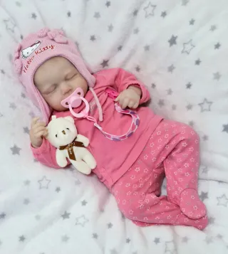 Muñeca bebé reborn con detalles muy realistas. - Pelo pintado - Ojos azules. - Pestañas largas. - Mejillas sonrosadas. - Incluye chupete y chupetero -biberon -conjunto de bata y pijama
