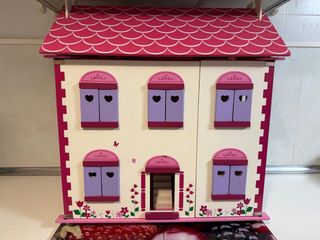 Casa de muñecas de madera de varios pisos, ideal para horas de juego. - Estructura de madera. - Diseño de varios niveles con habitaciones. - Incluye accesorios ( barbies no incluidas) -Altura 130 cm