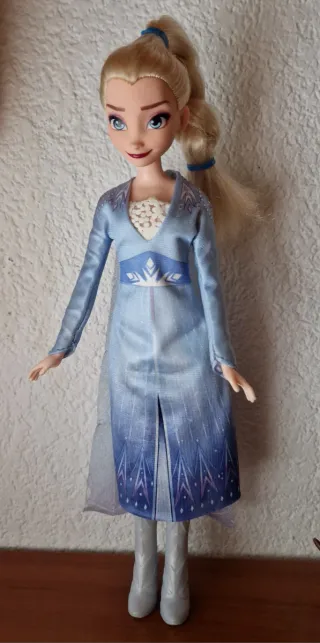 Muñeca Rosaura de gran tamaño. - Vestido azul con estampado floral. - Pelo rubio recogido en coleta.