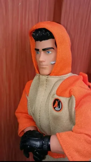 Muñeco de Action Man con traje naranja y beige. - Incluye guantes negros. - Detalle de logo 'M' en el pecho. - Capucha naranja.