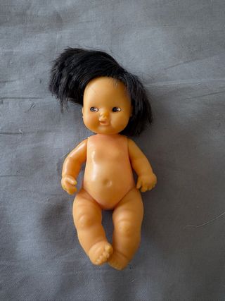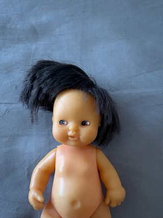 Muñeca antigua de la marca Barriguitas. - Fabricada en plástico. - Pelo negro. - Detalle de punto rojo en la frente. - Necesita limpieza