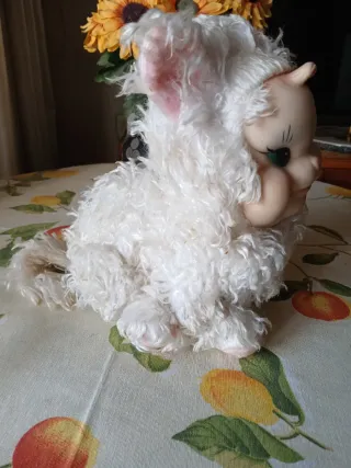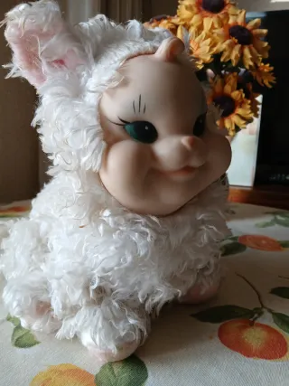 Antiguo y adorable muñeco de peluche con un diseño tierno y suave. - Cuerpo de peluche blanco rizado. - Cabeza de goma con detalles pintados. - Orejas rosadas y flexibles. - Ojos verdes expresivos. Venta en mano.