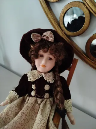 Preciosa muñeca de porcelana vestida con un traje de época y sombrero. - Vestido de terciopelo marrón y encaje. - Detalles de cadena y botones dorados. - Incluye una pequeña mecedora de madera.
