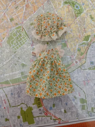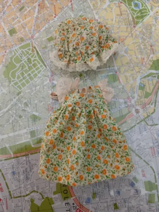 Conjunto de vestido y gorro con estampado floral, dela muñeca Laura de las montañas antigua - Vestido con volantes en las mangas. - Gorro a juego con detalle de encaje. Ver fotos dudas preguntar