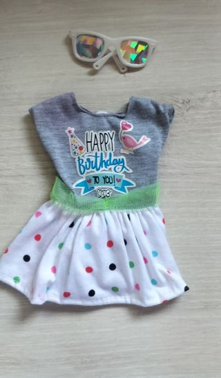 Precioso conjunto para muñeca Nancy. Incluye un vestido de dos piezas con estampado de lunares y una camiseta con mensaje de cumpleaños, además de unas gafas de sol. El vestido está en buen estado y las gafas parecen nuevas. - Vestido de dos piezas: camiseta gris y falda blanca con lunares de colores. - Gafas de sol blancas con cristales efecto arcoíris. - Ideal para regalar o para completar la colección de tu muñeca.