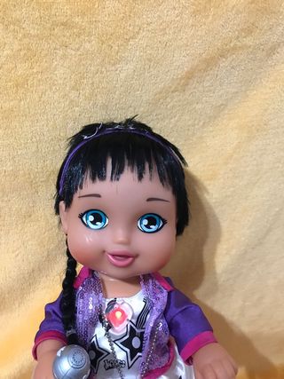Muñeca de la marca Jagget, modelo Famosa. Viene con accesorios. tiene sonidos y una luz en el corazon donde se pulsa para que funcione pero hay que encenderla detras no inclute pilas mide 36 cm como nueva - Incluye micrófono. - Incluye chupete. - Chaqueta brillante. - Vestido blanco con estrellas.