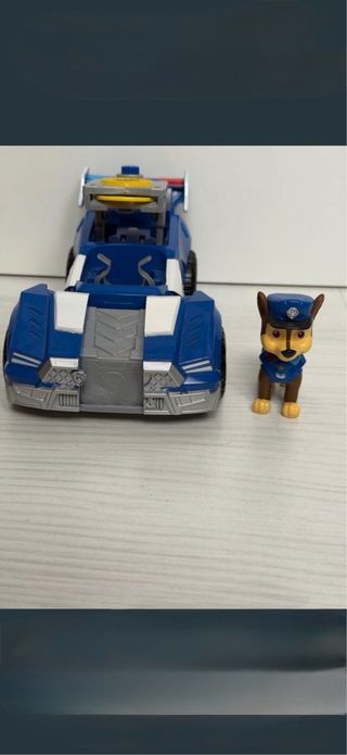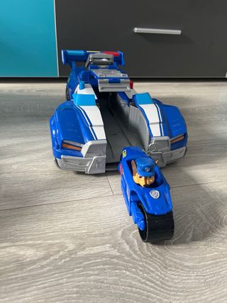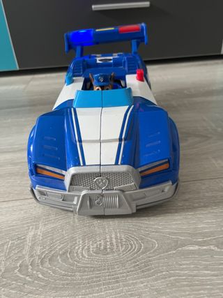 Vehículo de juguete del personaje Chase de la Patrulla Canina. Es de color azul con detalles negros y rojos. Sin muñeco - Diseño inspirado en la serie. - Parte trasera con enganche.