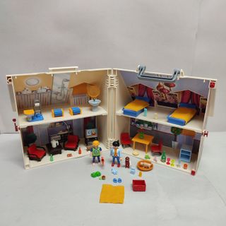 Maletín plegable de Playmobil que se abre para revelar una casa de muñecas. - Incluye figuras y accesorios. - Diseño compacto para llevar a todas partes.