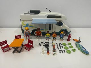 Set de Playmobil que incluye una caravana y figuras para recrear divertidas aventuras. - Caravana con diseño detallado. - Figuras de personas. - Accesorios de camping como mesa, sillas, extintor, vajilla y tabla de surf. Le faltan los retrovisores a la furgoneta pero a cambio he añadido un muñeco mas y algun accesorio mas