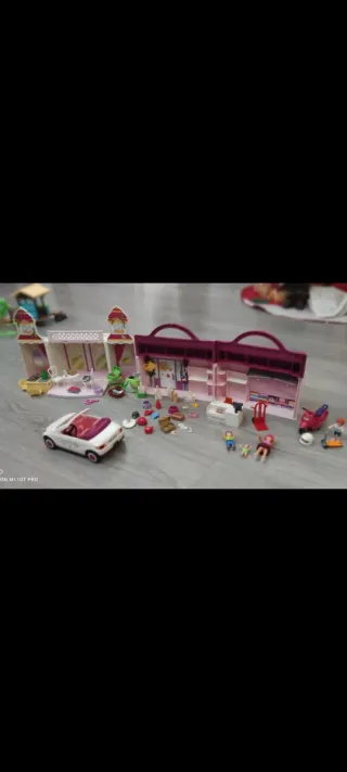 Conjunto de Playmobil que incluye una tienda boutique portáti con accesorios y muñecos varios+ casita/castillo princesas portátil con mobiliario variado y ropa+ moto y coche descapotable Todo original de Playmobil menos las dos sillas y mesa blanca que hay en el centro de la casita de princesas Precio por lote