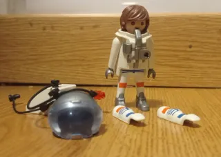 Figura de astronauta de Playmobil con traje espacial blanco y detalles en naranja y azul. - Casco transparente. - Accesorios incluidos.