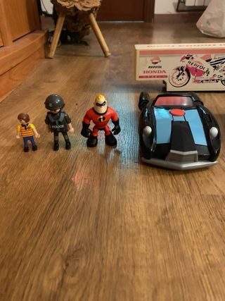 Lote variado de juguetes que incluye coches, el camión de Marc Marqurz, figuras de Playmobil y el muñeco del coche de super increible.