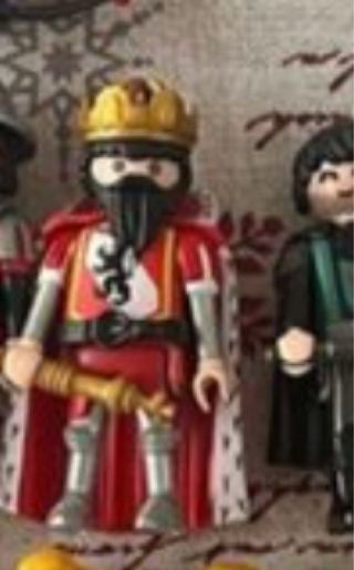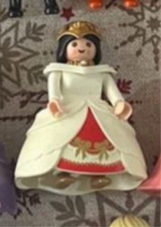 Figura de Playmobil de una reina con un elegante vestido. - Vestido blanco con detalles rojos y dorados. - Corona dorada. - Muñeca de colección.