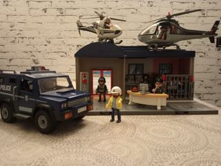 pack compuesto de comisaría, 2 helicópteros, todo terreno, 9 muñecos ( 8 policías y un ladrón) + accesorios.