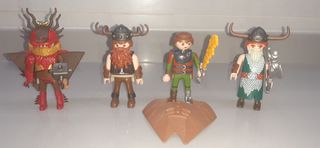 Set de 4 figuras de Playmobil de la serie Entrena a tu dragón. Con sus accesorios. Con la capa voladora de Hipo. Accesorios como espadas y martillos.