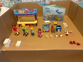 Conjunto de Playmobil que incluye un puesto de comida y cuatro figuras. - Puesto de comida con accesorios. - Cuatro figuras de Playmobil. - Incluye instrucciones.