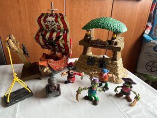 Conjunto de juegos de piratas que incluye un barco pirata y una isla pirata. - Barco pirata con vela. - Isla pirata con cartel Pirate Island. - Varios muñecos piratas. - Cañón y catapulta. Todo por 12&