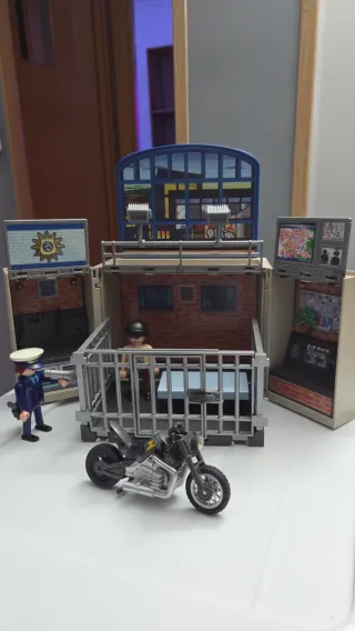 Maletín de Playmobil con temática de comisaría de policía. Se abre para revelar un interior detallado. No tiene muñecos, incluye lo que hay en las fotos.