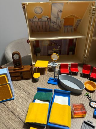 Casa de muñecas Playmobil con varios accesorios para amueblar y jugar. - Incluye camas, sillas, bañera, inodoro, mesa y más. - Ideal para recrear escenas y fomentar la imaginación. Se incluyen todos los accesorios que aparecen en las fotos. Varios no se incluían y han sido añadidos