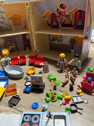 Casa de muñecas Playmobil con varios niveles y habitaciones. - Incluye figuras y accesorios que se muestran en foto . - Baño con bañera y WC. - Cocina equipada. - Dormitorios con camas y cuna. - Salón con muebles y perro. - Falta alguna pieza de la original