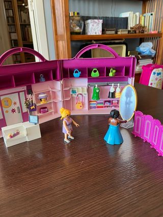 Boutique (tienda) de la marca playmobil,comtiene: dos muñecas a las que se les piede cambiar la ropa, tres perchas, cuatro bolsos, dos sombreros, una peluca, dos faldas, tres vestidos, un cambiador, un espejo, el mostrador y tres relojes. Es muy facil de transportar ya que tiene un hasa, pesa menos de medio kilo y lleva un cierre para que no se salga el contenido.