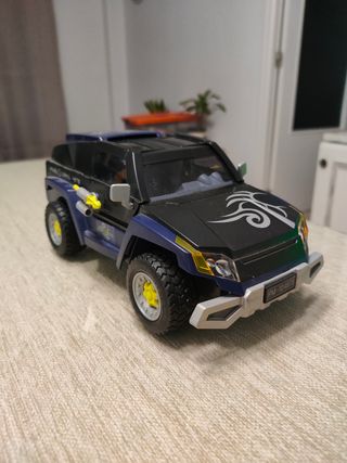 Coche todoterreno Playmobil en color negro con detalles en blanco y rojo. Incluye un muñeco con. El coche está en buen estado y listo para jugar. - Vehículo todoterreno - Color negro con detalles en blanco y rojo - Incluye un muñeco Playmobil