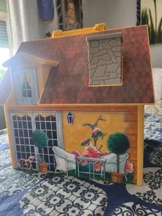 Casa de juguete Playmobil.,viene completa con muñecos Playmobil y todo lo que trae la casita dentro está todo nuevo - Techo a dos aguas rojo. - Fachada con ventanas y puerta. - Incluye asa para transporte.
