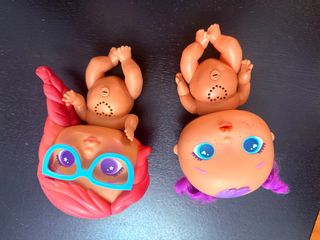 Set de dos muñecas Belly. - Cuerpo de bebé con cabeza de muñeca. - Cabello rojo y morado. - Accesorios como gafas.