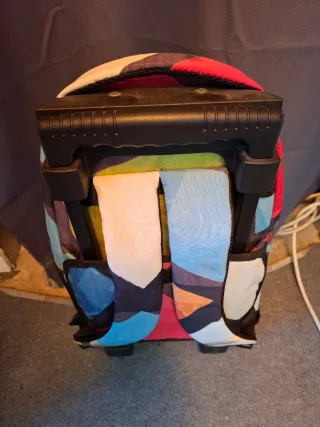 Mochila de carro con un diseño colorido y moderno, ideal para llevar tus pertenencias. - Diseño geométrico multicolor. - Compartimentos con cremallera. - Ruedas para facilitar el transporte.