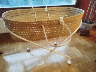 Minicuna tipo moisés con estructura de ruedas para facilitar su movilidad. El colchón es de 78cm, más largo que lo habitual. Regalo vestiduras del moisés. Comprado en Bambino. (No se realiza envío)