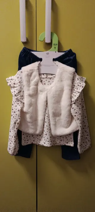 Conjunto de tres piezas para niña de Primark. - Incluye camiseta blanca con estampado floral y volantes. - Chaleco de pelo sintético blanco. - Pantalón azul marino. - Talla 18-24 meses (92 cm).