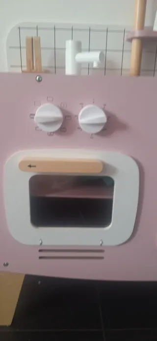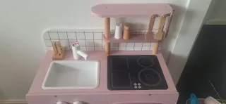 Juguete de cocina de madera en color rosa.Por 60 euros con set de limpieza. - Diseño con fregadero y fogones. - Incluye accesorios de cocina. - Estantería superior para colgar utensilios.
