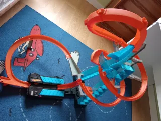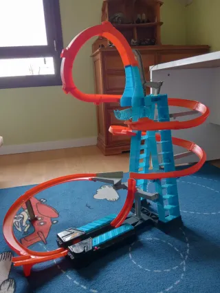 Circuito de carreras Hot Wheels con garaje. - Pistas de color naranja y azul. - Torre de lanzamiento. - Base con dos carriles - Con lanzador