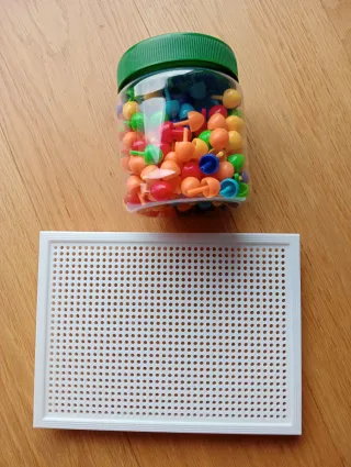Juego de rompecabezas con piezas de colores y un tablero. - Incluye un bote con múltiples piezas de colores. - Tablero blanco con cuadrícula de agujeros. - Piezas grandes. - A partir de 3 años.
