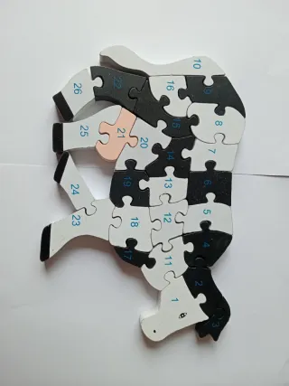Rompecabezas de madera con piezas numeradas y con letras del abecedario para armar la figura de vaca. - Piezas de madera. - Diseño a color blanco y negro con detalles.