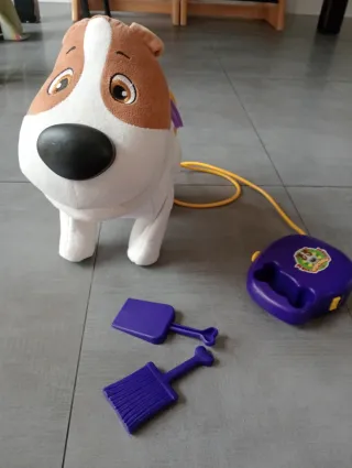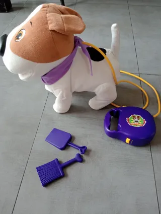 Peluche de perro con correa y accesorios para recoger sus caquitas. Va a pilas. Anda y hace caquitas. Con accesorios para recoger las caquitas. - Incluye un cepillo y una pala.