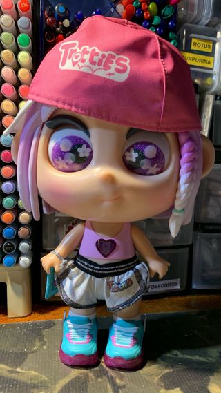 Muñeca Trotties Emma con gorra rosa y ropa deportiva. Luces mágicas. Zapatillas con luces de colores - Gorra rosa con logo. - Top rosa con corazón. - Falda blanca con detalles plateados. - Zapatillas deportivas azules y rosas.