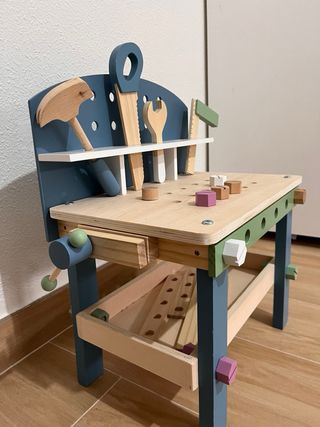 Divertida mesa de herramientas de juguete, perfecta para los pequeños manitas. Fabricada en madera con un diseño colorido y atractivo. - Incluye varias herramientas de madera como martillo, sierra y llave inglesa. - Piezas de construcción de madera. - Diseño robusto y seguro para niños.