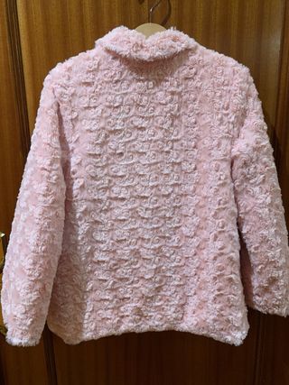Abrigo de pelo sintético en color rosa, ideal para niñas. - Talla 116 cm (equivalente a 6 años). - Diseño con textura de rosas. - Cierre de botones. - Bolsillos laterales. Le falta el ultimo botón.
