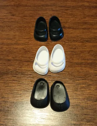 Lote de zapatos para muñeca Lesli, incluye un par en color blanco y otro en color negro. - Zapatos blancos estilo Mary Jane. - Zapatos negros estilo Mary Jane con detalle de puntadas. - Zapatos negros estilo bailarina con tira.