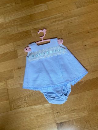 Conjunto de dos piezas para bebé en color azul claro, talla 6 meses. - Vestido con detalle de encaje y cintas. - Ranita a juego.