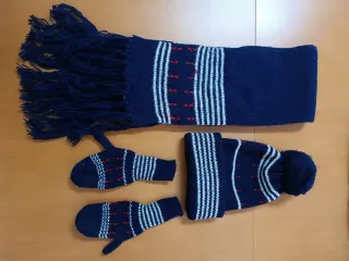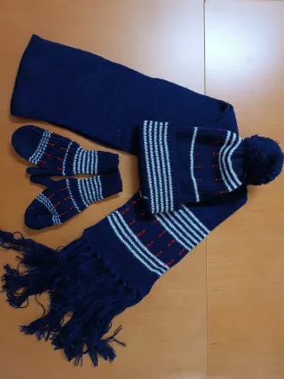 Conjunto de invierno para bebé, ideal para 3 o 4 años. Incluye gorro, bufanda y manoplas. - Diseño tejido en azul marino con detalles en blanco y rojo. - Gorro con pompón. - Bufanda con flecos. - Manoplas a juego.