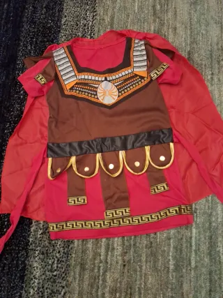 Disfraz de guerrero romano para niño, ideal para fiestas o juegos. - Incluye túnica con detalles dorados y capa roja. - Diseño inspirado en la armadura romana. - Adornos de grecas doradas en la falda y mangas.