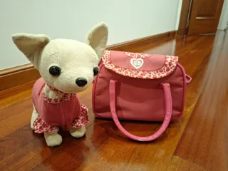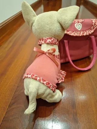 Perrito de peluche con forma de Chihuahua, vestido con un conjunto rosa y un bolso a juego. Es interactivo. Funciona con pilas y tiene 3 velocidades. Nota: pongo "en condiciones aceptables" porque las asas del bolso están un poco gastaditas.