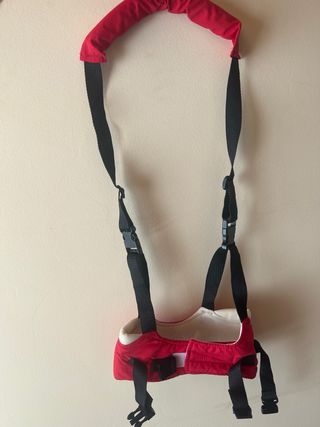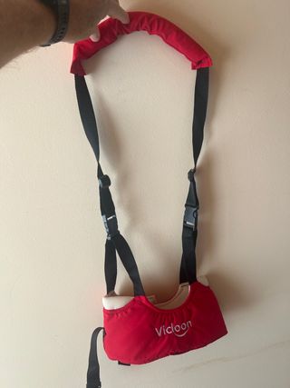 Arnés de aprendizaje para ayudar a los bebés a dar sus primeros pasos. Es de color rojo y tiene el logo de Vicloon. - Correas ajustables. - Asa acolchada para mayor comodidad.
