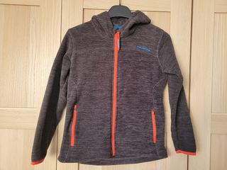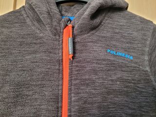Chaqueta polar de la marca Polinesia, ideal para niños. - Color gris jaspeado. - Cierre de cremallera naranja. - Dos bolsillos laterales con cremallera. - Capucha. - Logo de Polinesia en azul en el pecho.