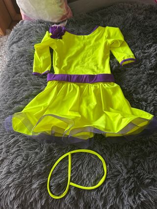 Licra de baile deportivo en color amarillo neón con detalles en morado. Ideal para clases o actuaciones. - Talla 6/8 años. - Manga larga. - Adorno floral en el hombro. - Falda con vuelo y detalles de tul. - Incluye aro para el pelo a juego.