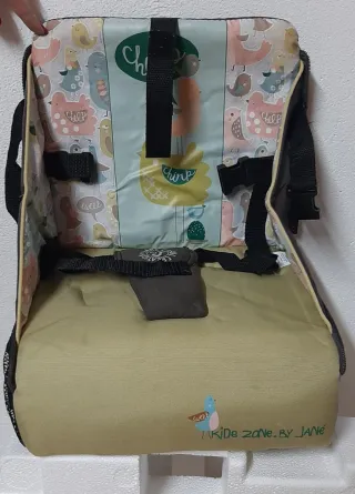 Asiento elevador portátil con un divertido diseño. - Estampado de pájaros en tonos pastel. - Incluye cinturón de seguridad de tres puntos. - Cómodo compartimento en la parte inferior para guardar biberones, juguetes, etc... - Ligero y fácil transporte con asa.