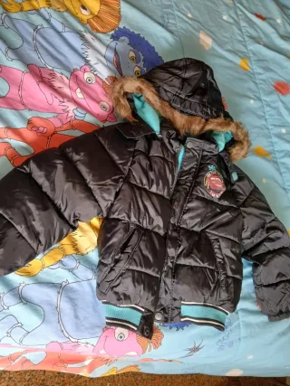 Cazadora acolchada negra para niño con capucha. - Diseño de Cars. - Forro interior azul. - Puños y bajo con detalles de canalé. - En perfecto estado, solo se uso un día.
