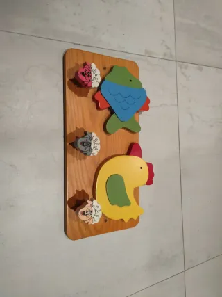 Percha decorativa infantil de madera con divertidos animales. - Diseño de pez y gallina. - Incluye figuras de cerditos. - Medidas: 40x18 cm.